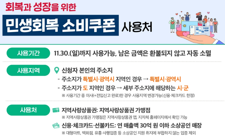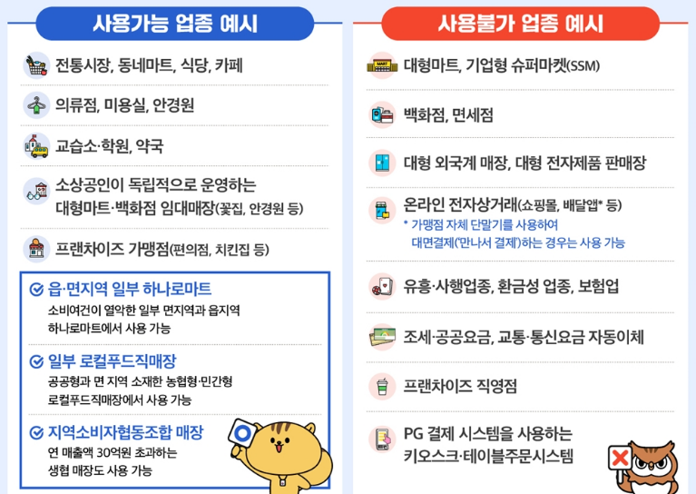 - 사용처: 연매출 30억원 이하 소상공인 업소, 일부 하나로마트·생협 등