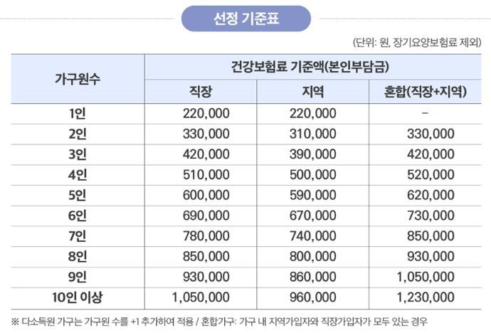 - 대상 기준: 자산(재산세 12억 이하, 금융소득 2천만 원 이하) + 소득(건강보험료 기준)