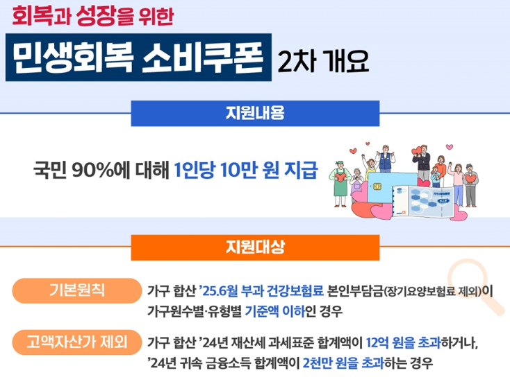 2차 민생회복 지원금은 단순히 전 국민 대상이 아니라 자산과 소득 기준을 적용한 맞춤형 지원입니다. 신청 기간은 9월 22일부터 10월 31일까지이며, 지급금은 1인당 10만원입니다. 지급 대상은 소득 하위 90% 국민으로, 자산 및 건강보험료 기준을 충족해야 합니다. 지급된 지원금은 11월 30일까지 지역 소상공인 업소에서 사용해야 하며, 미사용분은 자동 소멸됩니다.