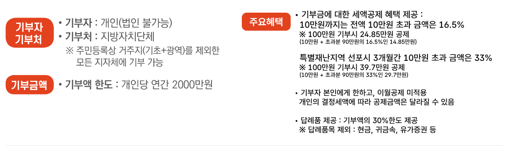 - 10만 원 초과분은 일반 지자체 기부 시 16.5% 공제