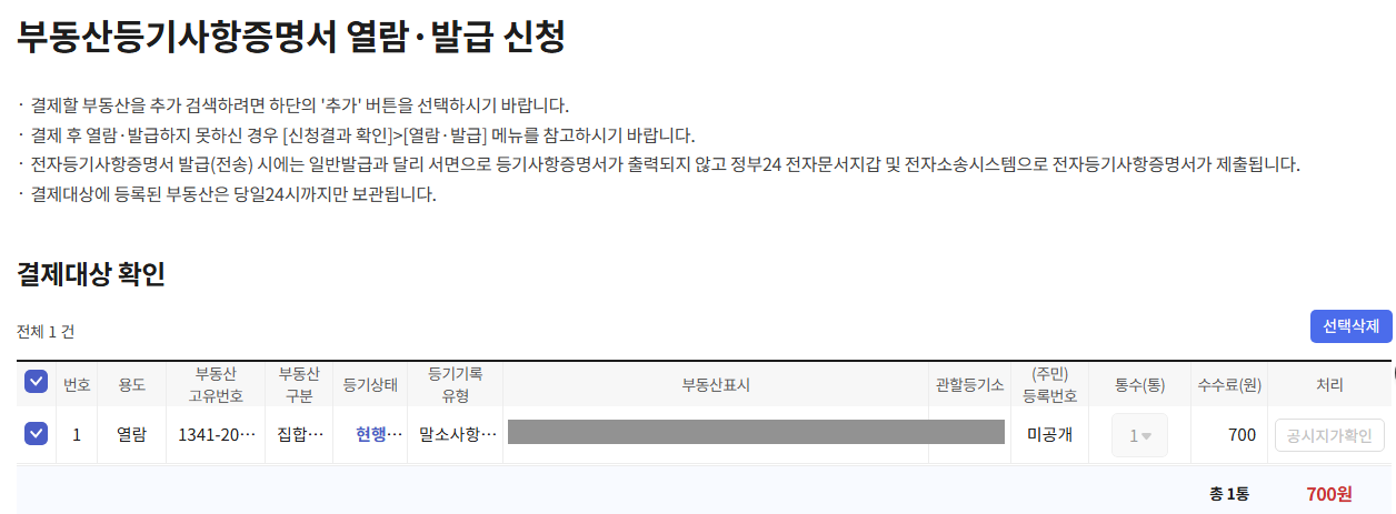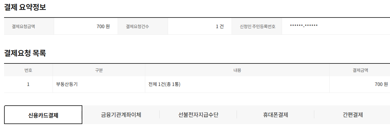 2. 인터넷 등기부등본 수수료와 결제 규정