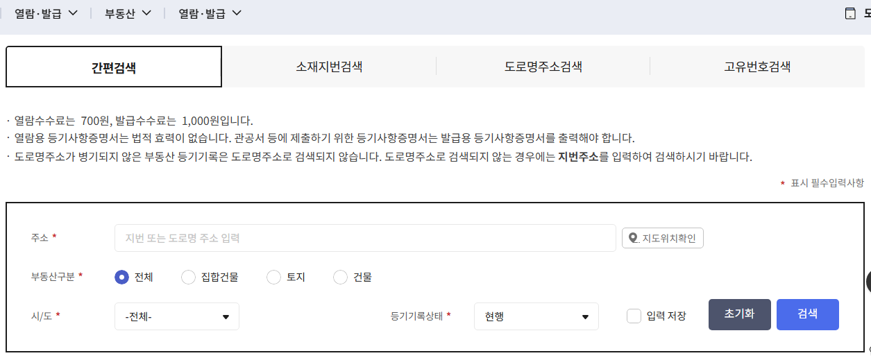 - 도로명주소가 병기되지 않은 등기기록은 지번주소로 검색해야 함