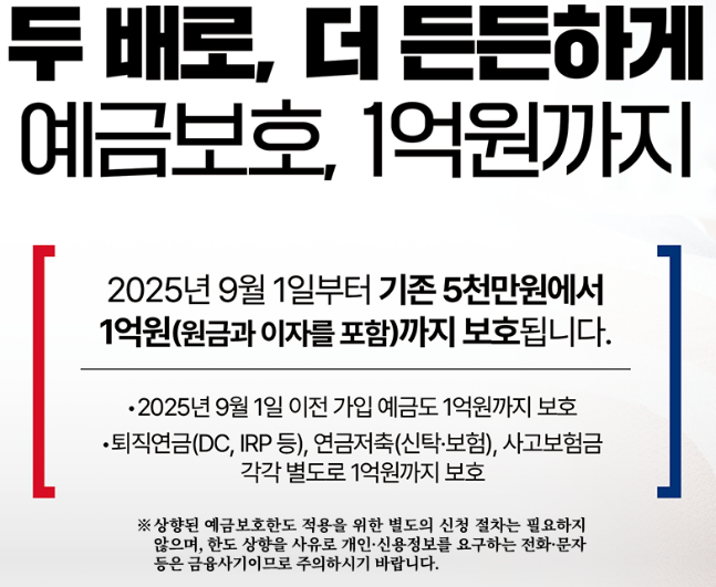 이번 조치는 예보공사에 가입된 부보금융회사뿐 아니라 상호금융권까지 적용 범위가 확대됩니다. 따라서 시중은행, 지방은행, 저축은행, 증권사뿐 아니라 신협, 농협, 수협, 산림조합 등도 동일하게 예금자보호 한도를 1억 원까지 보장합니다.