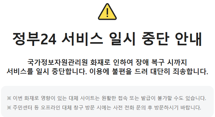 다만, 이번 화재의 영향으로 일부 대체 사이트 역시 접속이 지연되거나 원활하지 않을 수 있으므로, 발급이 반드시 필요한 경우에는 오프라인 창구를 병행 이용하는 것이 안전합니다.