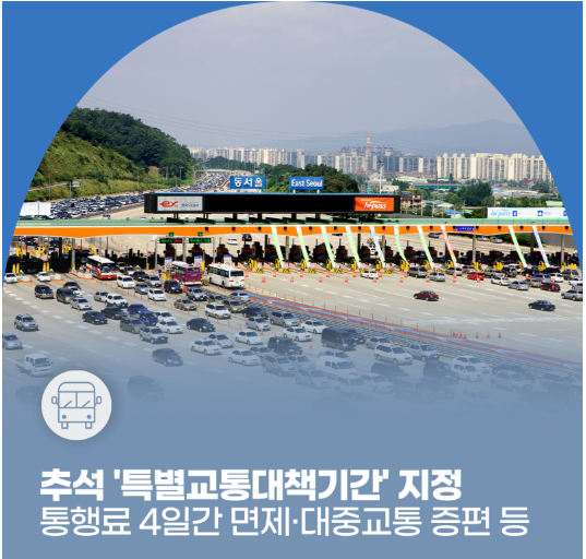 2025년 추석 연휴 동안 10월 4일부터 7일까지 전국 고속도로 통행료는 전면 면제됩니다. 그러나 귀성길은 4일 오전, 귀경길은 6일 오후부터 7일 저녁까지 정체가 극심할 것으로 예상됩니다. 무료 혜택을 활용하면서도 출발 시간 조정, 우회도로 선택, 안전 운전 습관을 병행한다면 보다 여유롭고 안전한 명절 귀향길이 될 수 있을 것입니다. 이번 추석에는 경제적 혜택과 함께 안전한 귀성·귀경을 실천해 가족과 소중한 시간을 보내시길 바랍니다.