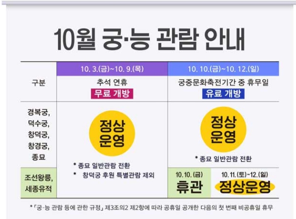 이번 연휴 기간 동안은 대부분의 시설이 휴무 없이 정상 개방되며, 박물관과 전시시설은 추석 당일(10월 6일) 하루만 휴관합니다. 긴 연휴를 이용해 도심 속 문화유산을 천천히 둘러보며 전통의 멋을 즐길 수 있는 최적의 시기입니다.