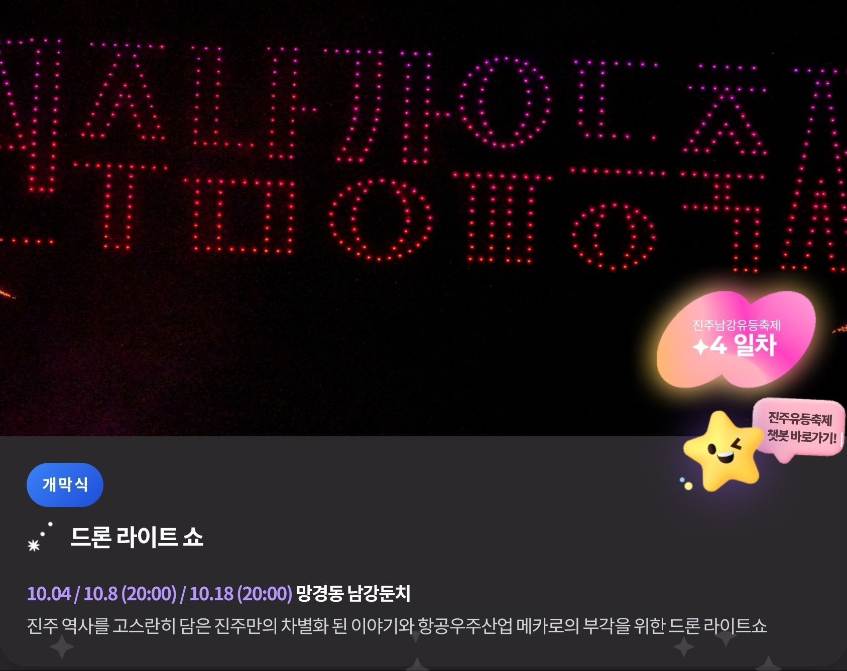 드론 공연은 남강 상공에서 500대의 드론이 실시간으로 움직이며 빛의 스토리를 연출합니다. 올해는 ‘진주대첩’, ‘논개의 희생정신’, ‘평화의 메시지’ 세 가지 테마로 구성되어 있으며, 음악과 불빛이 어우러지는 장관이 펼쳐집니다.