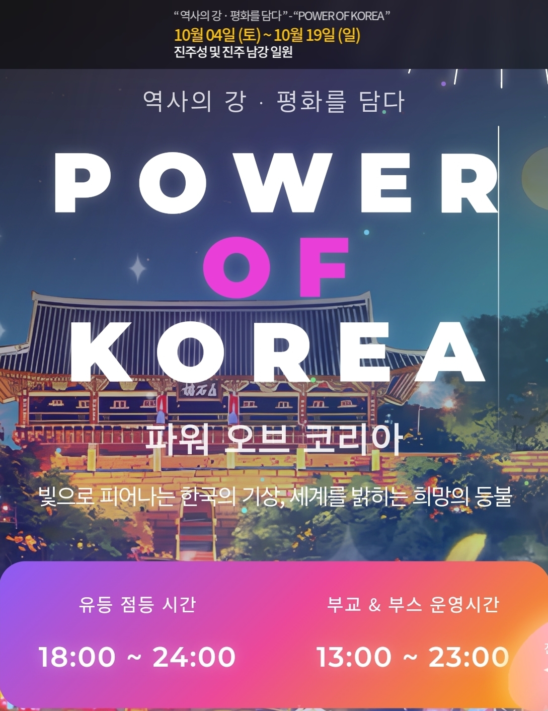 - 추천 시간: 오후 7시~9시 / 촉석루·남강다리 일대 관람 추천