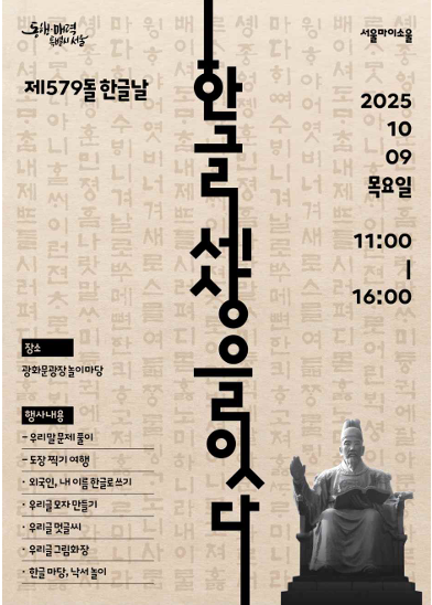 2025년 한글날은 단순한 기념일을 넘어, 우리가 사용하는 언어의 소중함을 다시금 되새기는 날입니다. 서울과 경기도 곳곳에서 열리는 다양한 행사에 참여해 한글의 가치와 창제 정신을 체험해보시기 바랍니다. 한글을 통해 세상을 잇는 오늘, 가족과 함께 의미 있는 연휴의 마지막을 만들어보세요.