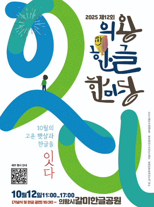 의왕시는 갈미한글공원에서 제12회 ‘의왕한글한마당’을 개최합니다. 한글 조형물이 전시된 공원 내에서 진행되는 만큼 장소 자체가 교육적이면서도 감성적인 분위기를 자아냅니다. 체험 프로그램으로는 ‘내 이름 기차 만들기’, ‘한글 비즈 키링’, ‘자음 주령구 놀이’, ‘빛그림극장’ 등이 있으며, 어린이뿐 아니라 성인도 참여할 수 있는 전통 공연이 함께 열립니다. 행사 후반부에는 ‘금모래 해금 병창’과 ‘강강술래’가 어우러지는 축하 무대가 열려 흥겨운 분위기로 마무리됩니다. 의왕시 관계자는 “세대가 함께 어울리며 한글의 소중함을 되새길 수 있는 행사로 자리 잡고 있다”고 전했습니다.