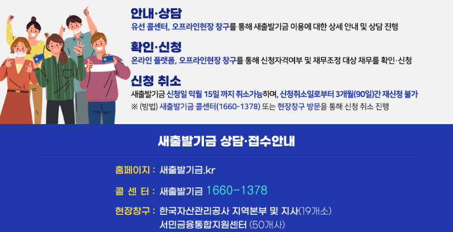 유의사항: 새출발기금은 문자나 전화를 통한 금전 요구나 개인정보 요청을 하지 않습니다. 의심되는 경우 새출발기금 콜센터(1660-1378)로 확인해야 하며, 공식 홈페이지에서만 진행 사항을 확인할 수 있습니다.