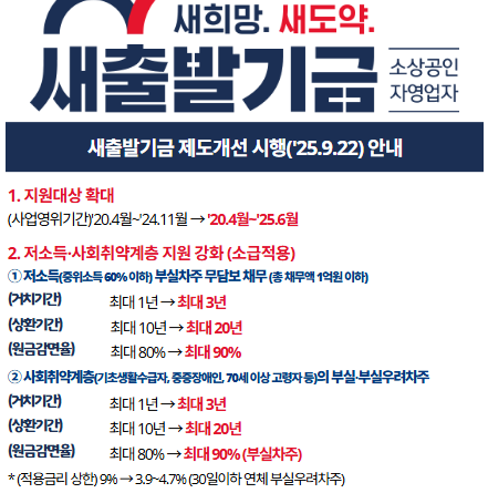 지원 대상 확대: 기존에는 2020년 4월부터 2024년 11월까지 사업을 운영한 소상공인과 자영업자만 지원 대상이었으나, 2025년 6월까지 창업한 사업자까지 포함되면서 최근 창업자도 새출발기금 지원 혜택을 받을 수 있습니다. 이에 따라 2024년 말 이후 사업을 시작한 신규 창업자도 안정적으로 재기를 준비할 수 있게 되었습니다.