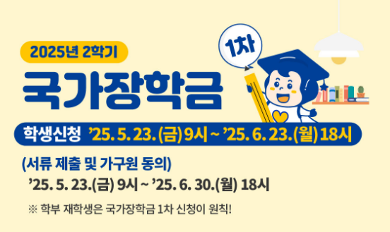 2025학년도 2학기 1차 국가장학금 신청은 5월 23일부터 6월 23일 저녁 6시까지입니다. 신청은 24시간 가능하나, 마감일인 6월 23일은 오후 6시까지만 접수됩니다. 이 점을 유의하여 여유 있게 신청을 완료하는 것이 중요합니다.