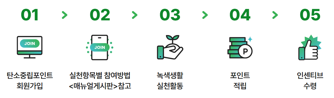 지구를 위한 작은 실천이 나의 포인트로 돌아오고, 나의 삶의 질을 향상시키며, 더 나아가 탄소중립 사회로의 전환에 기여하는 선순환 구조. 지금 바로 탄소중립포인트 누리집에 가입하고, 나만의 녹색생활을 시작해보세요.