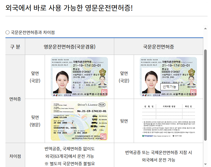 영문운전면허증은 국내 면허증과 동일한 효력을 가지면서도 외국에서도 본인의 운전 능력을 증명할 수 있는 문서입니다. 특히 일부 국가에서는 한국의 국제면허를 인정하지 않거나 별도 서류를 요구하기 때문에, 영문면허증이 더욱 유용한 경우가 많습니다. 이 역시 온라인 신청이 가능하며, 모바일 IC 운전면허증으로도 발급받을 수 있다는 점에서 디지털화의 장점이 극대화됩니다.