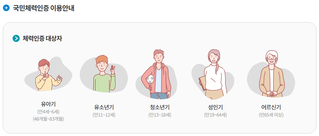국민체력100 인증센터는 만 11세 이상 전 국민을 대상으로 하며, 별도의 소득이나 거주지 제한 없이 누구나 무료로 참여할 수 있습니다. 일부 지역에서는 유아(만 4~6세)를 위한 시범 체력측정도 함께 운영되고 있습니다.