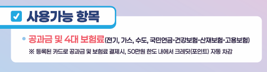 신청자가 선택한 1개 카드사를 통해 최대 50만 원의 크레딧이 지급되며, 본인 명의의 해당 카드사 신용·체크카드 전체에 자동 등록됩니다. 등록된 카드를 통해 공공요금 납부 시 크레딧이 자동 차감됩니다.