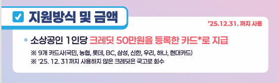 지원금은 실물 화폐가 아닌 크레딧(디지털 포인트)로 지급되며, 별도의 환급 절차 없이 지정된 카드사를 통해 결제 시 자동 차감되는 방식입니다. 특히 복잡한 증빙이나 서류 없이도 자동으로 사용되도록 설계되어, 소상공인의 행정 부담도 최소화하였습니다.