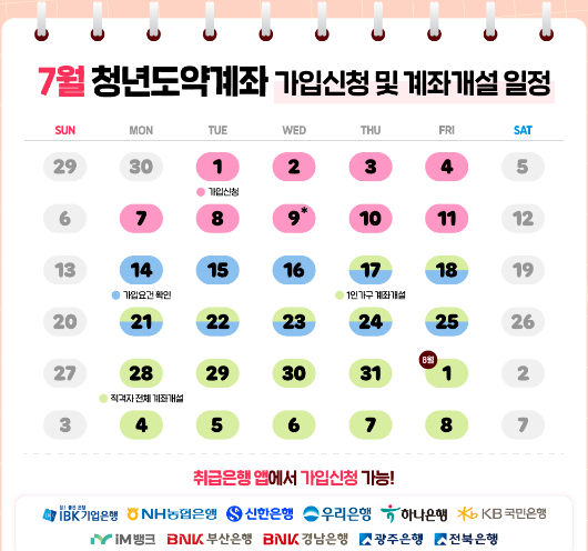 서민금융진흥원에 따르면 2025년 7월 청년도약계좌 신청은 7월 1일부터 11일까지 9영업일간 진행됩니다. 이 기간 내에 신청하지 않으면 다음 달까지 기다려야 하므로 반드시 기간 내 신청이 필요합니다.