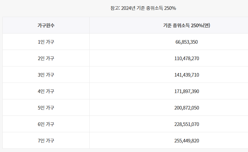 예를 들어, 1인 가구 기준으로는 월 소득 약 500만 원 이하여야 하며, 2인 이상 가구의 경우 가구 구성원 수에 따라 중위소득 기준은 달라집니다. 이 조건은 신청 시점의 전년도 소득을 기준으로 확인됩니다.