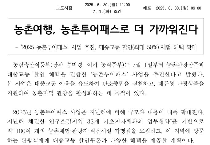 교통비 부담을 줄이고, 지역 특색이 담긴 체험까지 누릴 수 있는 농촌투어패스. 특히 2025년 확대 시행을 맞아 혜택도 늘어나고 사용도 더욱 간편해졌으니, 올여름 농촌으로 떠나는 계획이 있다면 꼭 활용해보시길 바랍니다.