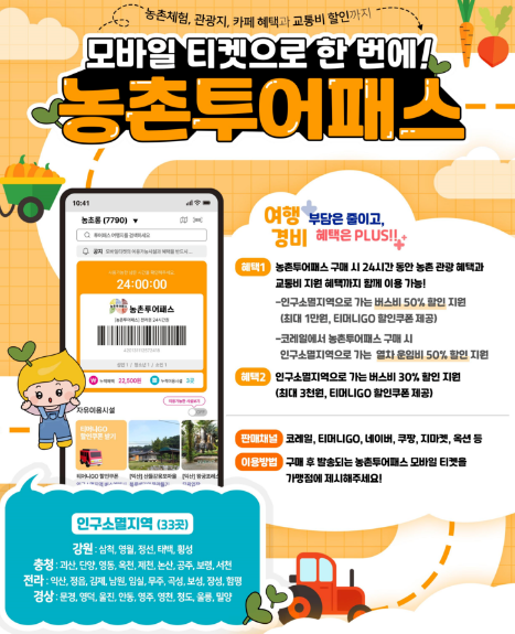 농촌에서의 힐링 여행이 교통비 부담 없이 더 가깝게 다가오고 있습니다. 바로 2025년부터 본격적으로 확대 시행되는 ‘농촌투어패스’ 덕분인데요. 이 패스를 활용하면 대중교통을 통해 인구소멸지역을 여행하면서 다양한 체험과 할인 혜택을 동시에 누릴 수 있습니다.