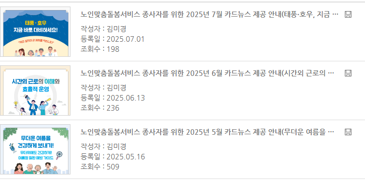 배움터는 단순히 교육 콘텐츠만 제공하는 것이 아니라, 매월 주요 돌봄 이슈와 현장 대응 요령을 담은 카드뉴스를 배포하고 있습니다. 2025년 기준으로도 매월 1회 이상 정기 발행되고 있으며, 폭염 대비, 감정노동 대처, 시간외 근로 기준 등 실질적 도움이 되는 주제를 중심으로 구성됩니다.