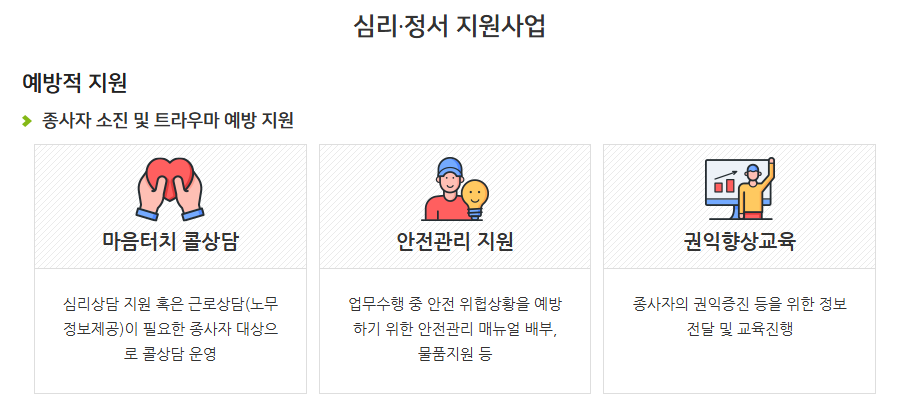 노인돌봄 업무는 신체적 피로뿐 아니라 정신적 스트레스도 큽니다. 이에 따라 배움터는 심리지원 프로그램을 운영해 전문의 상담, 심리치료 등 정신건강 서비스를 지원합니다. 지원 범위는 병·의원 또는 정신건강복지센터 이용 시 실제 발생한 치료비 기준으로 최대 80만 원까지 실비 보전이 가능하며, 진단서와 진료영수증 등을 구비해 신청할 수 있습니다. 해당 프로그램은 참여자의 정서 회복과 장기근속 유지에 기여하고 있습니다.