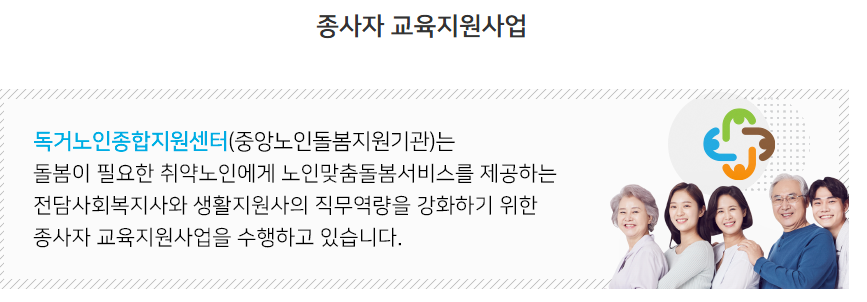 이에 따라 독거노인종합지원센터는 ‘노인맞춤 돌봄 서비스 배움터’를 운영하며 체계적인 교육을 제공하고 있습니다.