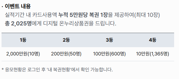 상생 페이백 신청자에게는 추가 혜택으로 '상생소비복권' 이벤트가 제공됩니다. 50만 원 이상 누적 카드 결제 시 최대 10장까지 복권이 제공되며, 1등 당첨자는 2,000만 원 상당의 디지털 온누리상품권을 받을 수 있습니다. 이를 통해 소비자의 참여와 흥미를 유도하고 추가 혜택까지 누릴 수 있습니다.
