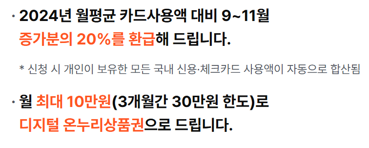 환급액은 2024년 월평균 카드 소비액 대비 2025년 9~11월 소비액 증가분의 20%로 산정되며, 월 최대 10만 원, 총 30만 원 한도로 지급됩니다. 지급 시기는 9월, 10월, 11월 소비 증가분 각각 다음 달 15일부터 순차적으로 이루어집니다. 디지털 온누리앱을 통해 상품권이 지급되며, 지급일로부터 5년간 사용 가능합니다.