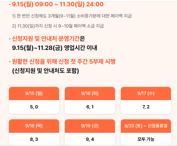 온라인 신청은 초기 혼잡을 방지하기 위해 출생연도 끝자리를 기준으로 5부제를 적용합니다. 9월 20일부터는 모든 국민이 자유롭게 신청 가능하며, 이 기간 동안 신청 지연이나 오류를 최소화하도록 시스템이 설계되어 있습니다.