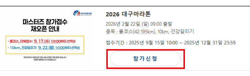 - 10km 및 건강달리기 접수: 2025년 9월 22일(월) 오전 10시 시작, 선착순 마감