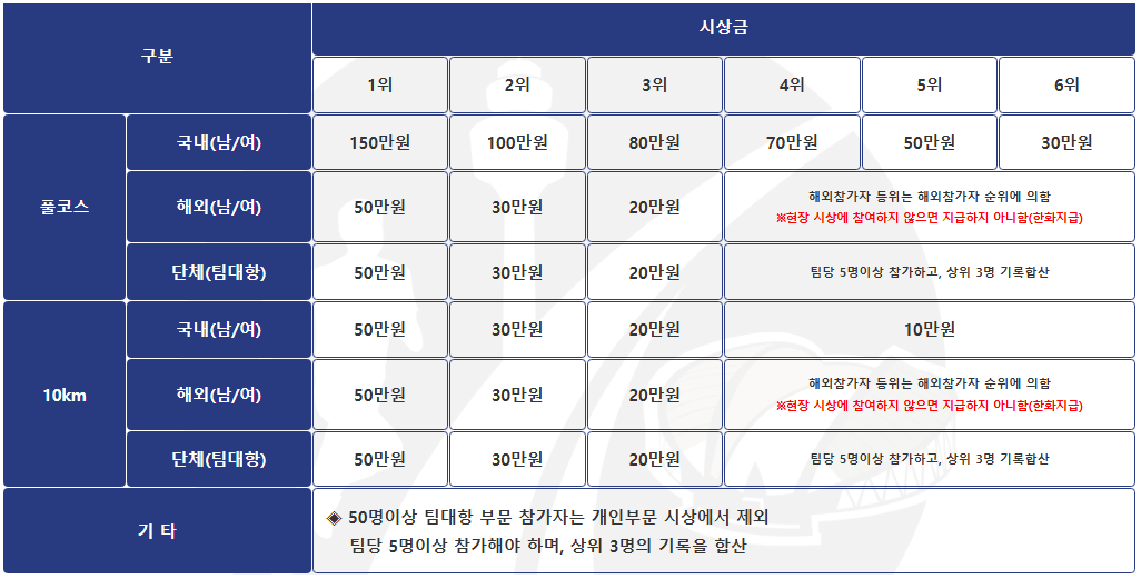 10km 코스 참가비는 5만 원입니다. 참가자에게는 기념품, 수건, 식사가 제공됩니다. 비교적 짧은 코스임에도 불구하고 대회의 열기를 충분히 느낄 수 있어 많은 초보자들이 선택합니다.